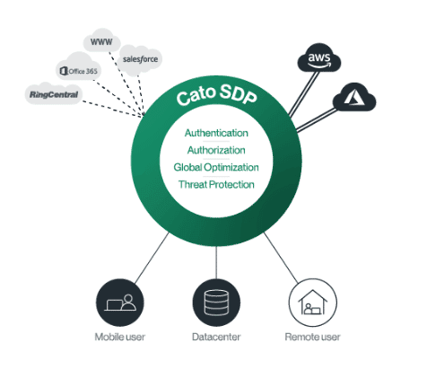 Cato SDP 使遠端使用者能夠透過agent or agentless客戶端或無客戶端瀏覽器存取,透過安全且最佳化的連線存取所有業務應用程式。 Cato Cloud 是全球化原生雲服務,可隨時擴展以容納任意數量的使用者,而無需部署專用 VPN 基礎架構。使用者採用xDSL或4G…等連線到最近的 Cato PoP,其流量透過 Cato 全球專屬骨幹網路優化路由到在地或雲端應用程式。 Cato 的安全即服務堆疊可保護遠端使用者免受威脅並強制執行應用程式存取控制。