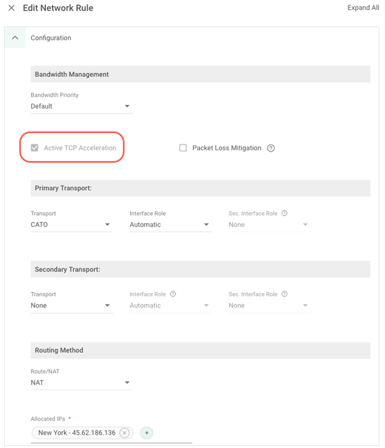 在網路規則中選擇出口(egress) IP或位置時,PoP 會充當連線的代理伺服器,Cato 會自動啟動 TCP 代理。您無法在 Cato 管理應用程式中停用出口規則的 TCP 加速。以下螢幕截圖展示了一個出口網路規則,其中「Active TCP Acceleration」選項呈現灰色(Network > Network Rules > Edit Rule)。