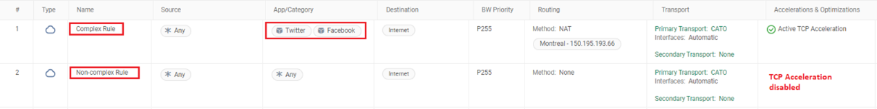 下面的範例顯示禁用 TCP 加速的網路規則 #2。由於規則 #1 是包含應用程式的複雜規則,因此符合網路規則 #2 的流量將套用 TCP 代理。為了在這種情況下停用 TCP 代理,網路規則 #2 必須放置在複雜規則(規則 #1)之上。