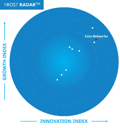 Frost Radar™ for SASE,是根據SASE公司的持續創新及將創新轉化為持續成長的能力來進行評估。Frost & Sullivan認為CATO為 SASE 的成長和創新領導者,CATO在Frost Radar創新指數中排名最高。Frost & Sullivan 也指出 CATO Networks是一家在這兩類領域同時都表現出色的單一SASE供應商。