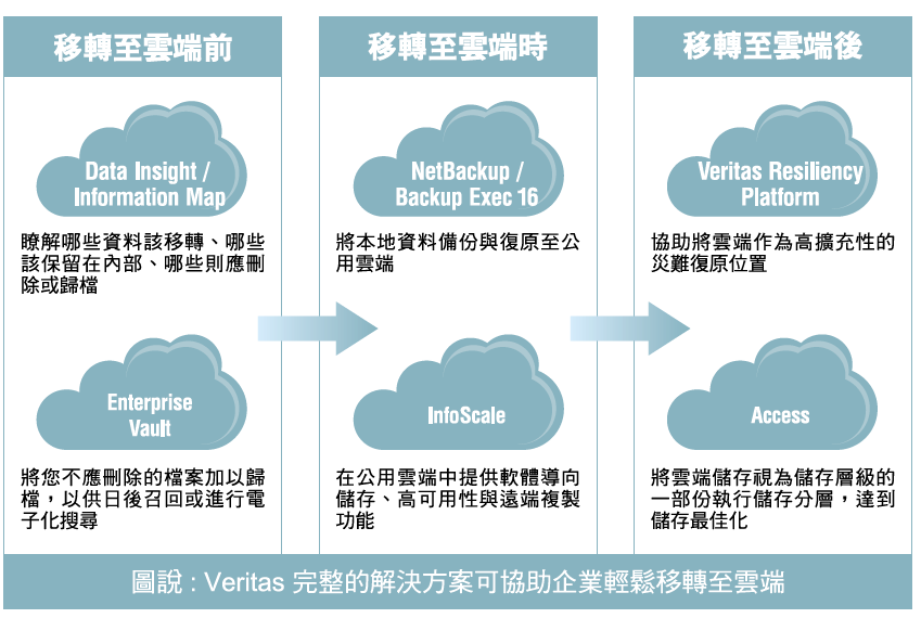 我們建議您在將資料移至雲端前中後,可利用以下這些解決方案,為您的資料帶來全面性的能見度、只儲存與保護真正有價值的資料,簡化移轉至雲端的工作、並且在彈性與控制風險之間取得平衡,充分發揮轉型至雲端的效益: