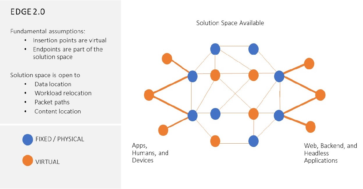 在Edge 2.0 中,「邊緣運算」不再由特定位置的實體 PoP 定義。相反地,是由Edge 2.0 控制平台動態定義,以控制存在於客戶需要之位置的資源:公有雲、管理程序、資料中心或私有雲端,甚至是業務獨有之「遠端」位置的實體機器。連線網路功能也可以使用軟體定義方式傳遞,並覆蓋在私有或公用 WAN 基礎架構上,無須費力組合和配置。其將根據應用程式之要求,提供自訂的軟體定義彈性邊緣運算,以回應目標應用程式的「意圖宣告」。「邊緣運算」及其在該宣告中做為應用程式建立的所有內容,將成為簡單易用的應用程式屬性。