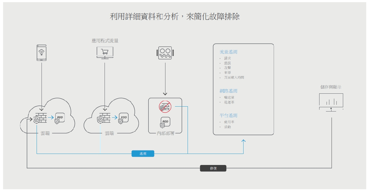 應用程式的健康度和效能故障排除是很大的挑戰。問題的根源可能有很多,例如應用程式代碼缺陷、網路問題、應用層攻擊或機器人流量激增(惡意或非惡意)等。在許多組織當中,開發與網路團隊之間的流程延遲會影響問題解決的速度,讓情況變得更糟。即使是在高度協作的 DevOps環境,仍然需要適當工具來識別效能遲緩的原因,才能快速解決問題。