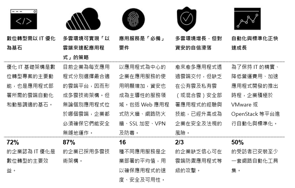 在F5的2018年「應用程式交付現狀(The State of Application Delivery)」研究報告裡,超過3,400位受訪的業務及技術主管與專業人士共同指出,在亞太及全球擴散的數位轉型浪潮已衍生出五大重要趨勢: