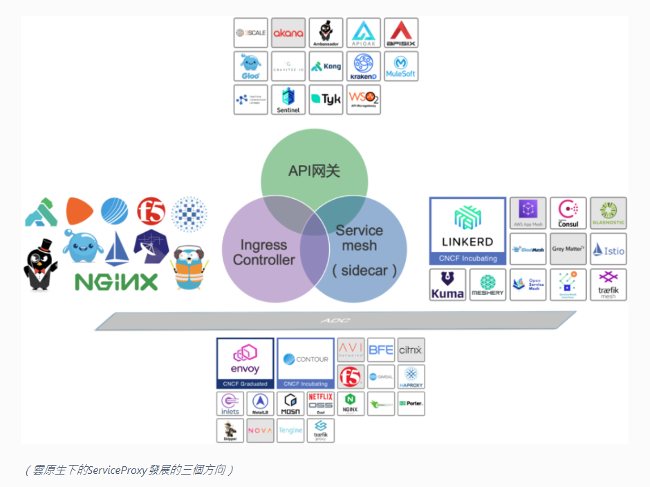 2017年左右,伴隨著雲原生的發展,Service Proxy 開始大量出現。 圍繞 Ingress Controller,Sidecar,API 閘道的產品層出不窮,如Linkerd,Envoy,Gloo,Mosn等等。 從傳統ADC 到如今以服務為中心的現代羽量級解耦式 Service Proxy,技術正在回歸到類似面向 Web 的簡單的負載均衡時代,用戶端負載均衡或服務端負載均衡。