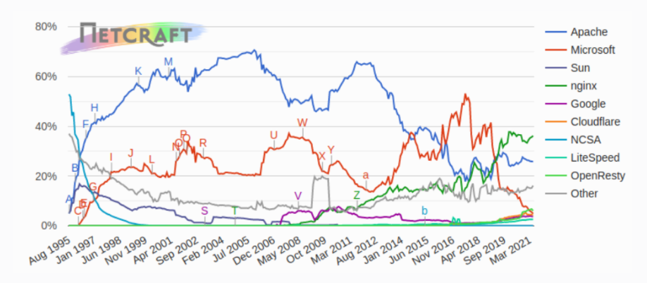2004年Igor Sysoev開源了NGINX,本來只是個人的興趣而已,沒想到2021年NGINX正式超越Apache,成為全球頭號Web伺服器軟體,並且這個趨勢看著會一直持續下去。