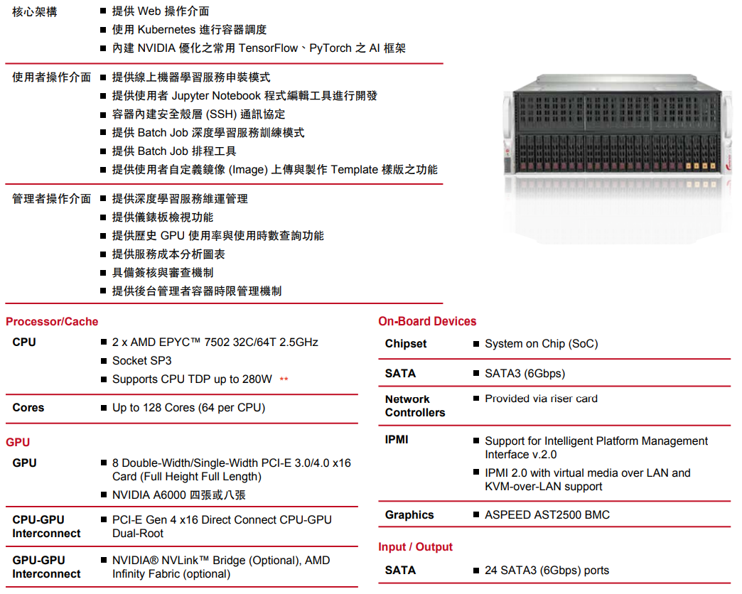 內建NVIDIA優化之常用TensorFlow、PyTorch之AI框架,並具備AI框架擴充設計。用戶可快速搭建實驗環境,滿足用戶在深度學習訓練與推論中從模型研究、模型建立、批量訓練、模型佈署模型推論的需求。同時提供多種算法模型,輸入大量數據和圖像資源即可進行模型的訓練與研究,更輕鬆進行深度學習的訓練和研究工作。