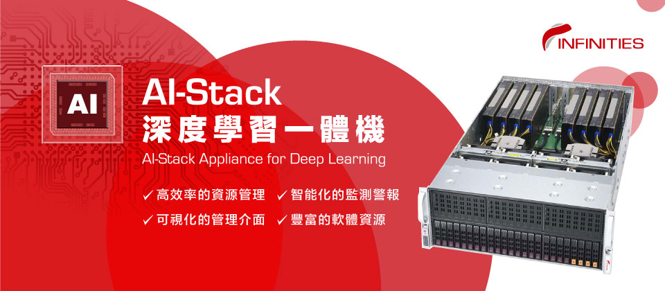 數位無限AI-Stack深度學習一體機是針對產業AI開發單位、教育和研究機構進行深度學習訓練而開發的軟硬體整合一體化平台,可幫助用戶建構GPU資源池,實現計算資源的統一管理與調配,提升用戶在人工智慧領域的研發生產能力,適用於各類人工智慧研究、深度學習訓練、醫療影像分析、各種辨識分析等應用情境。