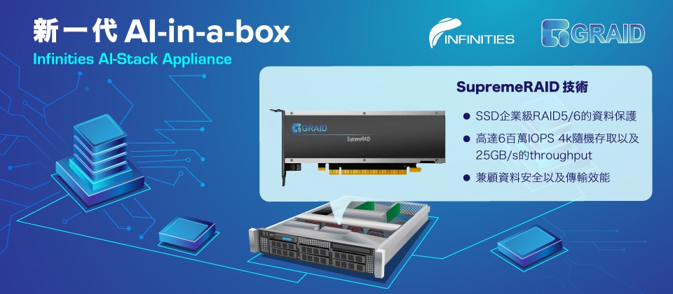 看好AI需求的發展,數位無限軟體與新創公司GRAID Technology聯手打造新一代的AI-in-a-box產品。數位無限以自有品牌「Infinities AI-Stack Appliance」為基礎,加上GRAID Technology的SupremeRAID技術,提供底層SSD企業級RAID5/6的資料保護,打破傳統RAID的瓶頸,提供高達6百萬IOPS 4k隨機存取以及25GB/s的throughput,讓AI運算過程中IO不再是一個瓶頸,且兼顧資料安全以及傳輸效能。