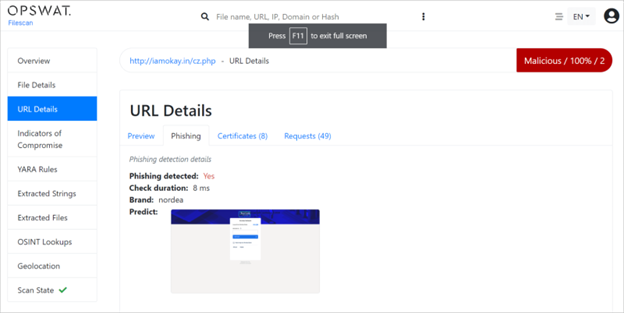 提交 URL 時,OPSWAT Filescan 將自動確定它是“文件 URL”還是網頁。對於常規網頁,會執行完整的瀏覽器模擬,包括基於機器學習的網絡釣魚攻擊圖像分析。這是一個很好的例子,說明 OPSWAT Filescan 如何檢測潛在網路釣魚攻擊並向用戶發出警報: