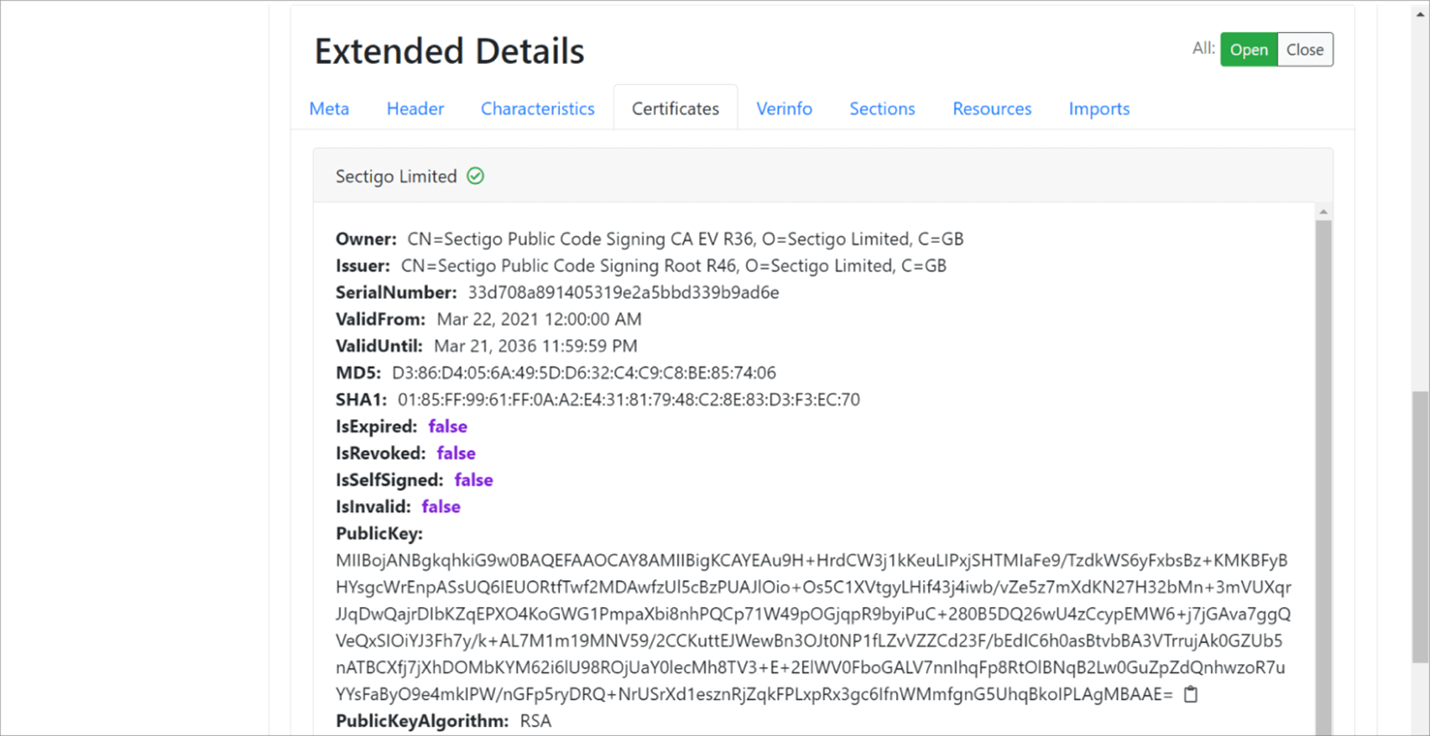 OPSWAT Filescan.io 不僅可以從 PE 文件中提取證書,還可以從 PDF 或 VBA 巨集等生產力文件中提取證書。檢查所有提取的證書以確定它們是否過期、吊銷或自簽名。當受信任的軟體供應商頒發證書時,該二進制工件的判定會自動設置為良性。