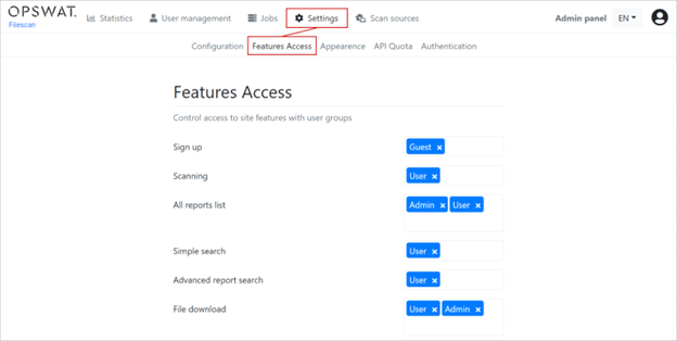 個別群組權限可以通過使用頂部選單欄導航到「設置 > 功能訪問」來進行配置。例如,您可以配置哪個群組被允許訪問哪個功能。