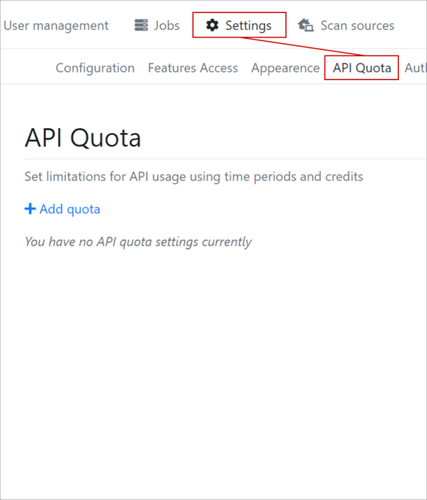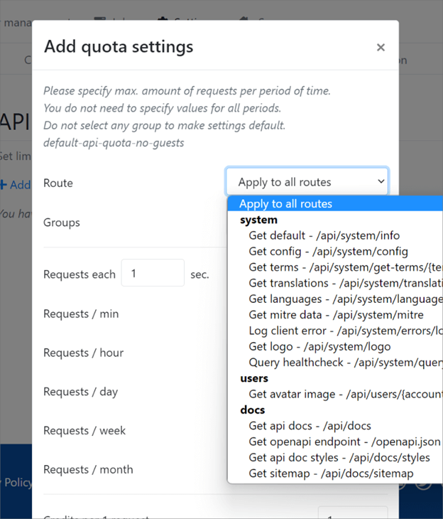 我們有一個非常廣泛的API 配額設置子頁面,允許使用非常精細的配置選項在路由或每個組的基礎上設置API 配額。