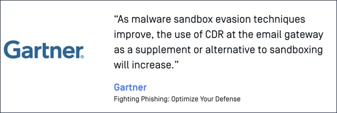 什麼是Deep CDR? 其全名為Deep Content Disarm and Reconstruction (深度內容解除及重建),我們可以簡單的解釋成-檔案解除武裝化(深度清洗);解除武裝?沒錯!我們可以思考一下如果所有的檔案進到企業環境前,都繳交了具攻擊性的武器,那進到企業內部後就不存在任何的威脅了,這就是我們一直在提到的“檔案零信任”,Trust no Files. Trust no Device. ,同時Gartner 也提及了一件重要的事,越來越多的惡意軟體正在做著規避偵測的動作,以往利用特徵、沙箱等技術都存在著許多被規避的風險,CDR的技術可以大幅提升防護等級。