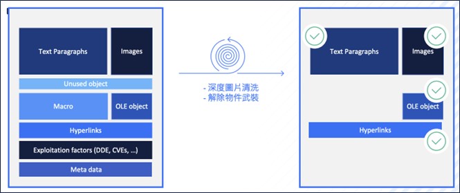底下是個範例:當文件中存在本質上不應該存在的物件,透過解除武裝後,同樣的檔案還是可以正常使用,將具備武裝的物件清洗移除。