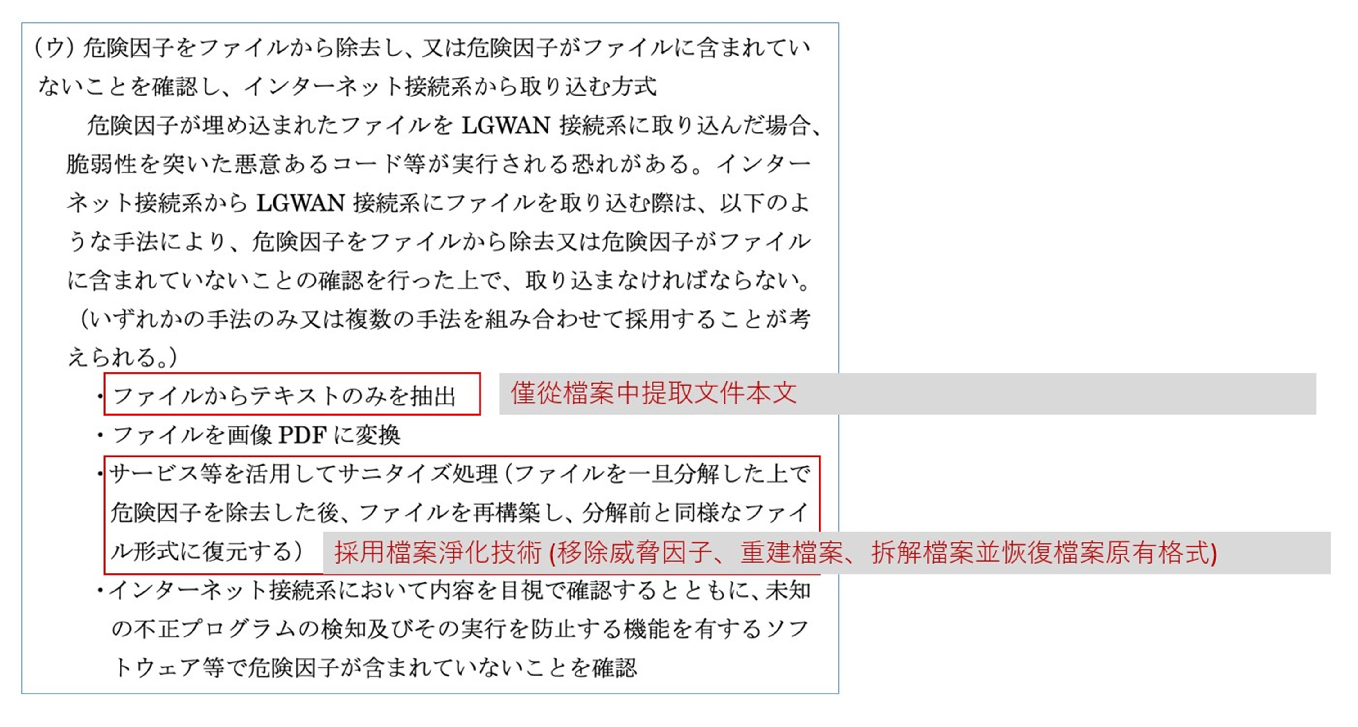 2022年3月,日本總務省發佈了地方政府信息安全政策指引(https://www.soumu.go.jp/main_content/000805453.pdf),該安全政策指引中提到LGWAN (Local Government Wide Area Network) 需注意的關鍵事項,需注意危險因子去除的重要性,其關鍵在於檔案交換、使用時之安全性強化,著實也強調著CDR的重要性。