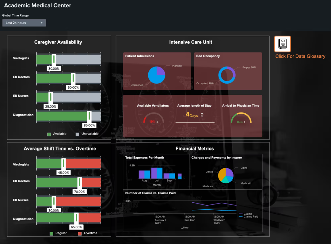 儀錶板左側顯示的人員配備可用性的即時洞察使部門主管和 CXO 能夠調整時程表並優化其護理資源。 右上象限是重要的醫院指標,這些指標可能會影響服務的可用性,並可能不得不提供其他住宿。 最後,右下角顯示了等式付款方的關鍵財務指標的快照。