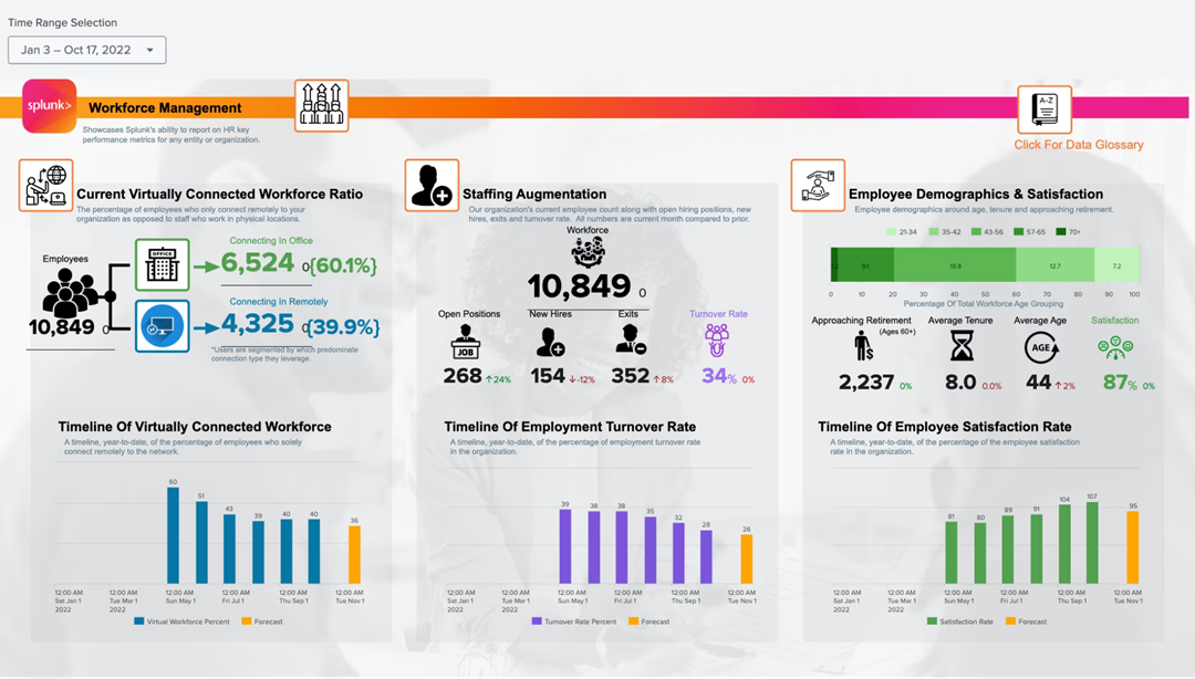 即使在「大辭職」之後,監控員工滿意度以及維護和規劃組織的員工隊伍也是許多組織的首要任務。 此儀錶板在單個視圖中提供員工工作地點、職位空缺、任期和滿意度的單一視圖,使高管及其人力資源合作夥伴能夠確定關注和潛在改進的領域。