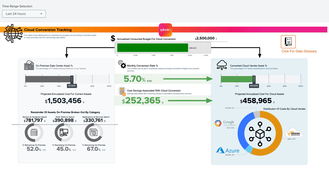 轉換為雲是許多組織的首要任務。 然而,即時瞭解進度和實現的節省可能是一個挑戰。 儀錶板的左側從成本和完成百分比的角度顯示遷移到雲的基礎結構和應用程式的進度。 右側突出顯示了雲支出和迄今為止實現的節省。