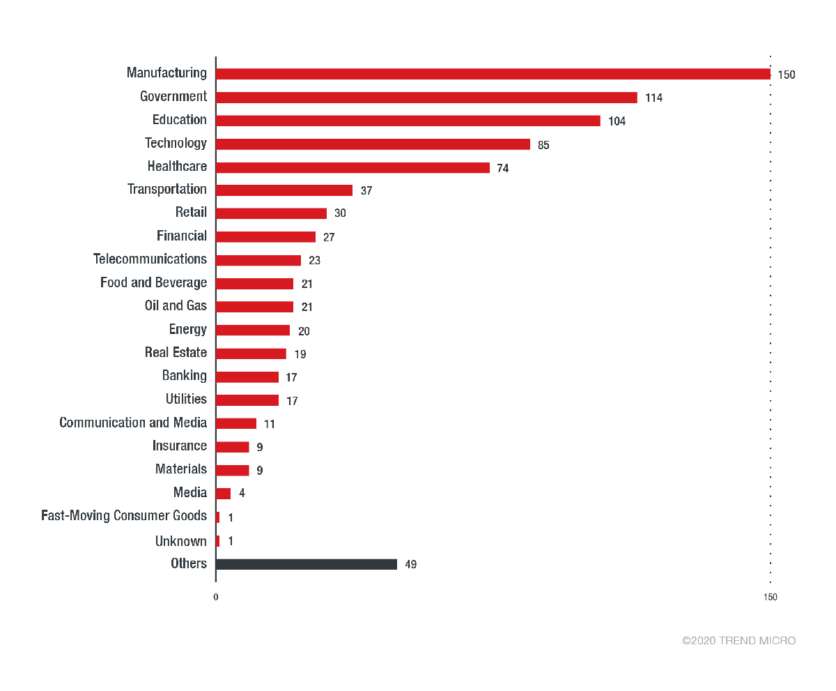 圖 1:2020 年第 3 季受勒索病毒影響的產業 (Smart Protection Network 的資料)。