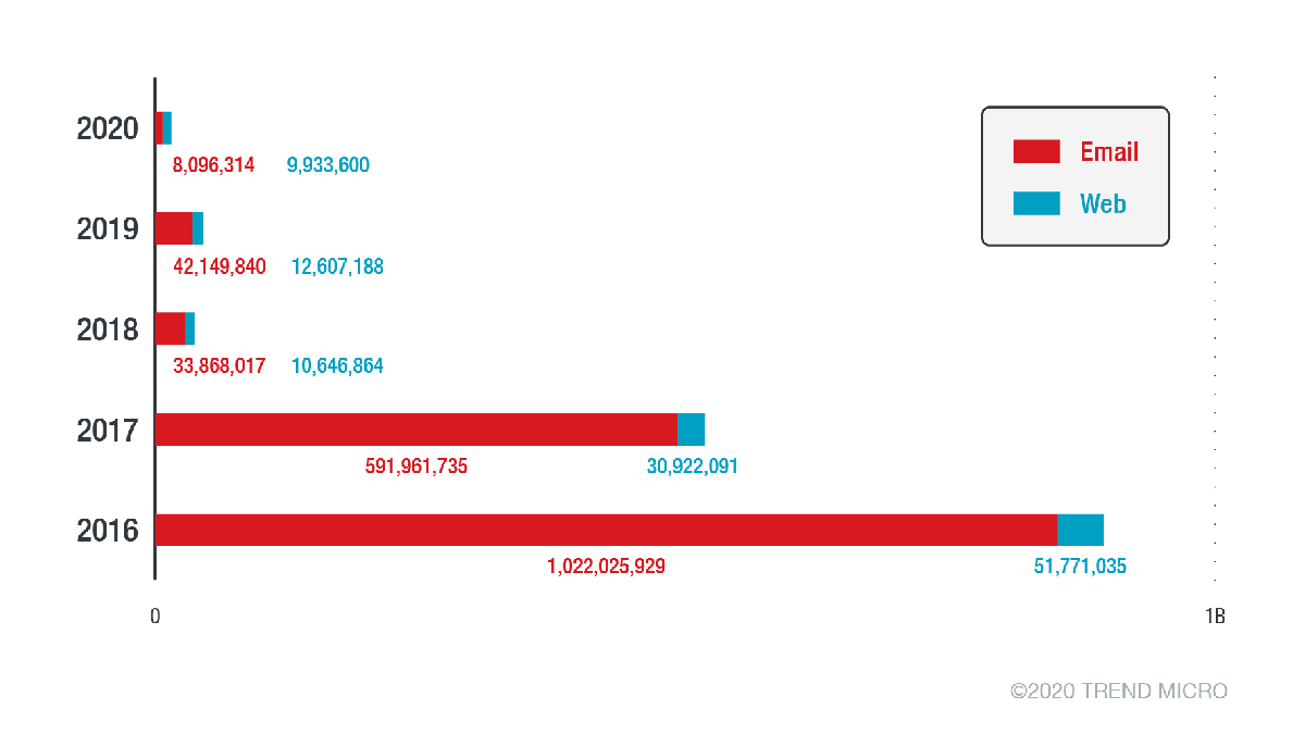 這些年來,經由電子郵件附件或惡意網站入侵企業的勒索病毒已大幅減少 (見圖 4)。不過若從媒體報導來看,許多人會覺得網路上的勒索病毒數量似乎並未減少。