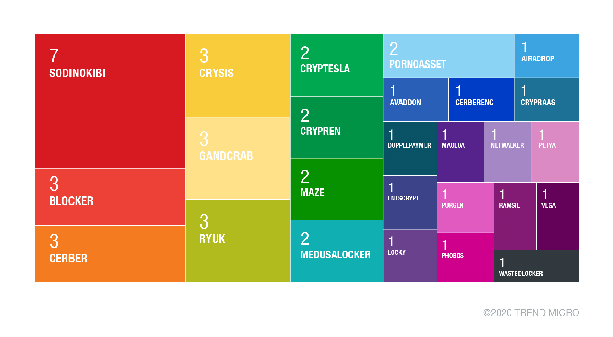 圖 5:專門攻擊製造業網路的各種勒索病毒家族 (2020 年第 3 季)。
