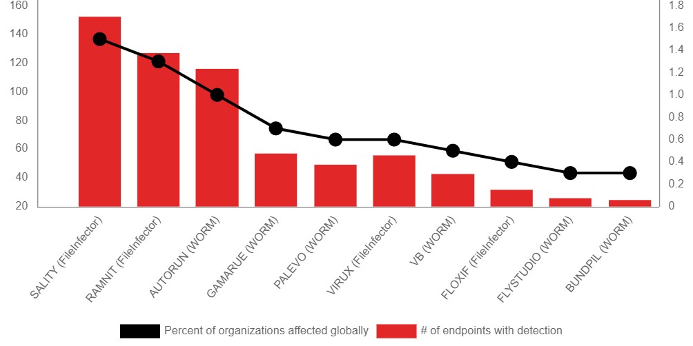 2020 年,我們偵測到最多的老舊惡意程式變種為:Sality、Ramnit 和 Autorun。儘管它們的背後或許並非一些知名駭客集團,但當工業網路出現這類蠕蟲,代表企業在資料備份與隨身碟管理的安全上出了狀況。